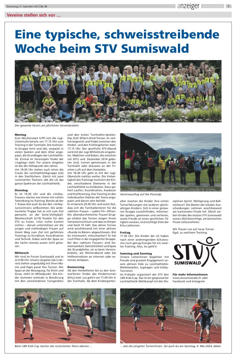Weisst du wie eine Woche im STV Sumiswald aussieht? Nein? Viel Vergnügen beim Lesen von diesem Bericht (Seite 7).
